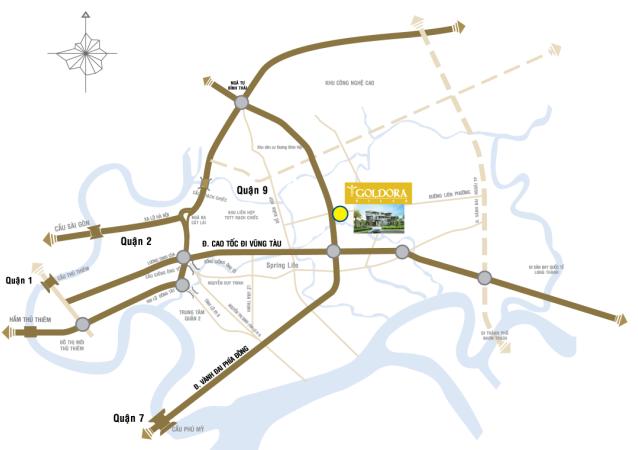 Biệt thự cao cấp Goldora Villa tọa lạc tại mặt tiền đường Liên Phường, thuộc phường Phú Hữu, Quận 9, kế cạnh Villa Park, sát bên đường Cao tốc Long Thành – Dầu Giây và đường Vành Đai Trong.